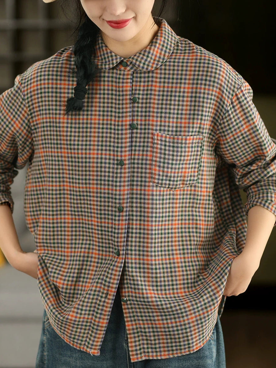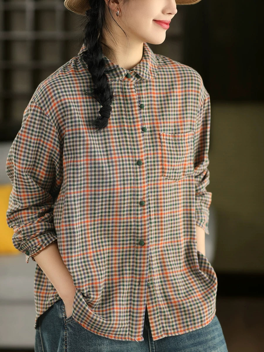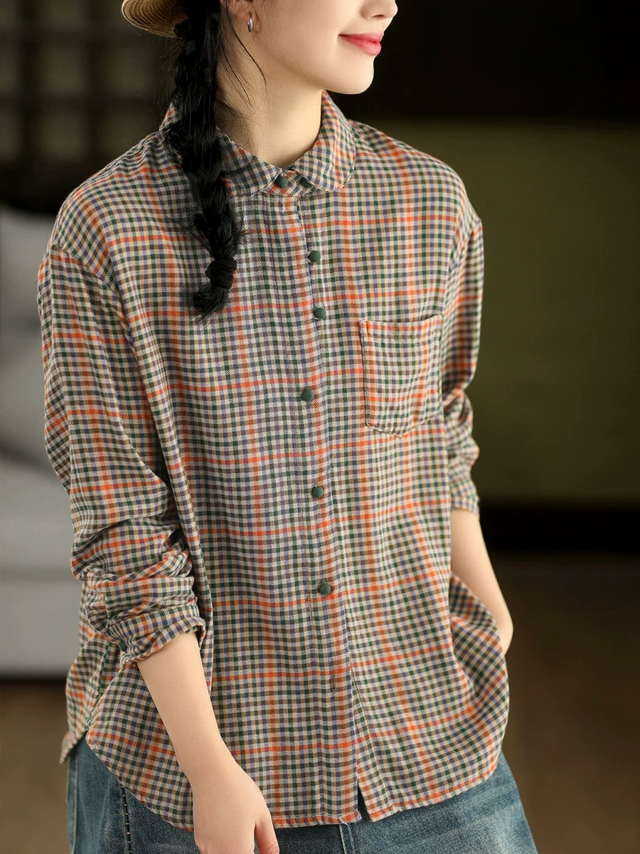 Dame forårsskjorte med kunstnerisk ternet krave og 100% bomuld
