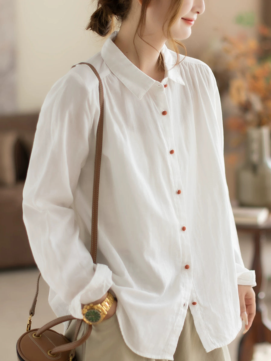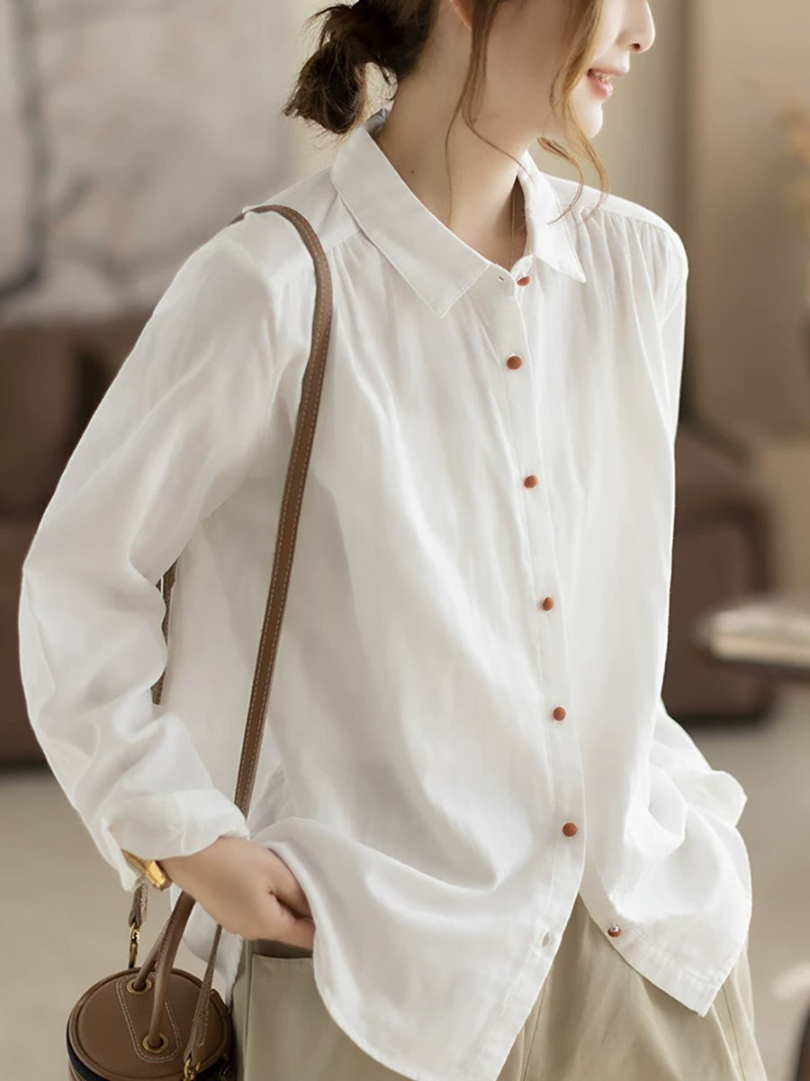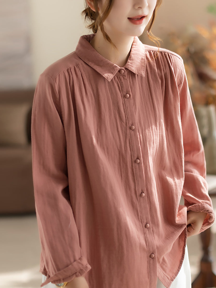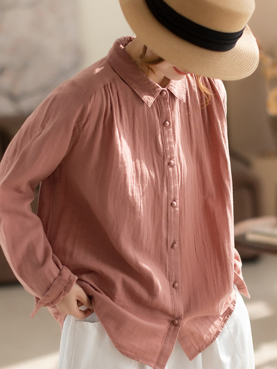Dame forårsskjorte med kunstnerisk, ren farve og 100% bomuldskrave
