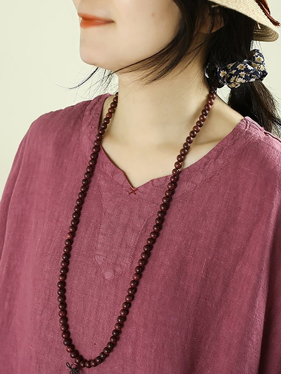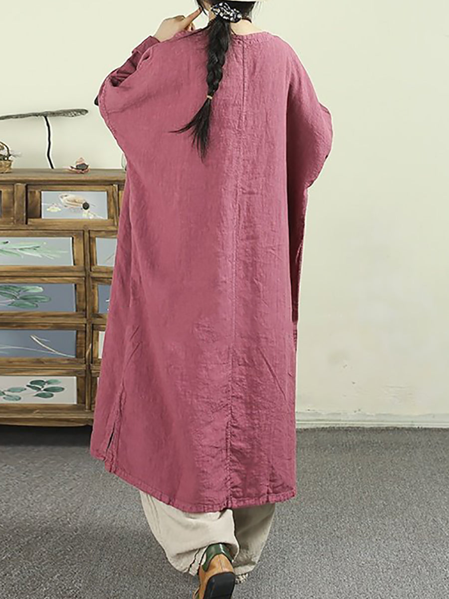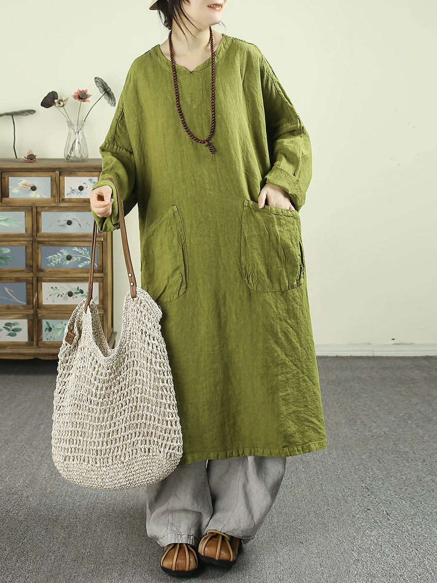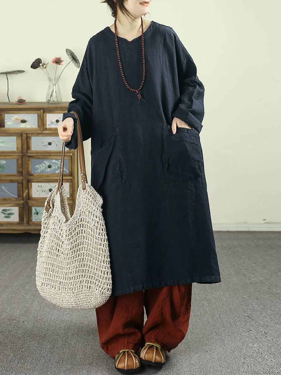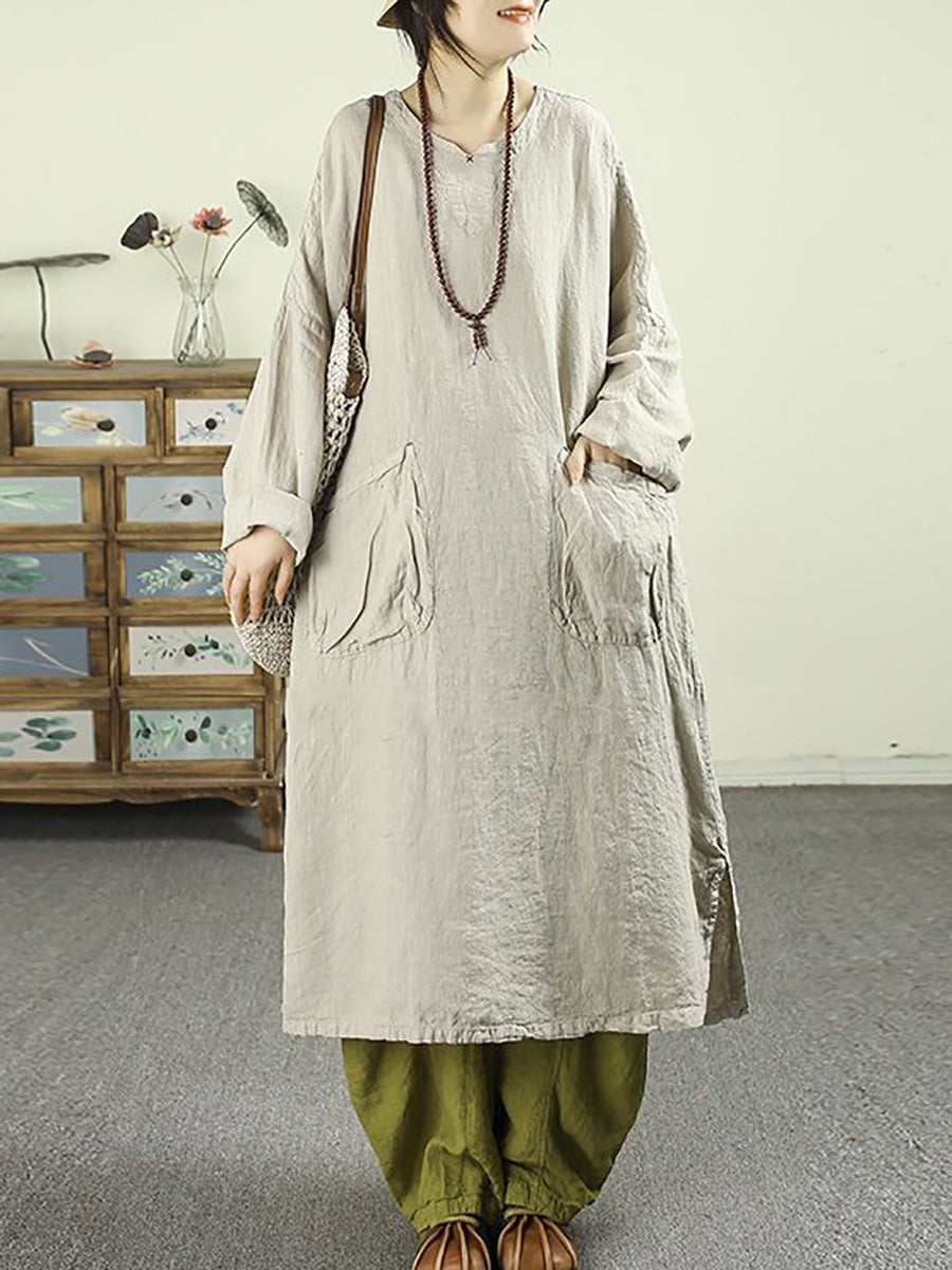 Forårskjole med O-hals i 100% linned i ren farve til kvinder