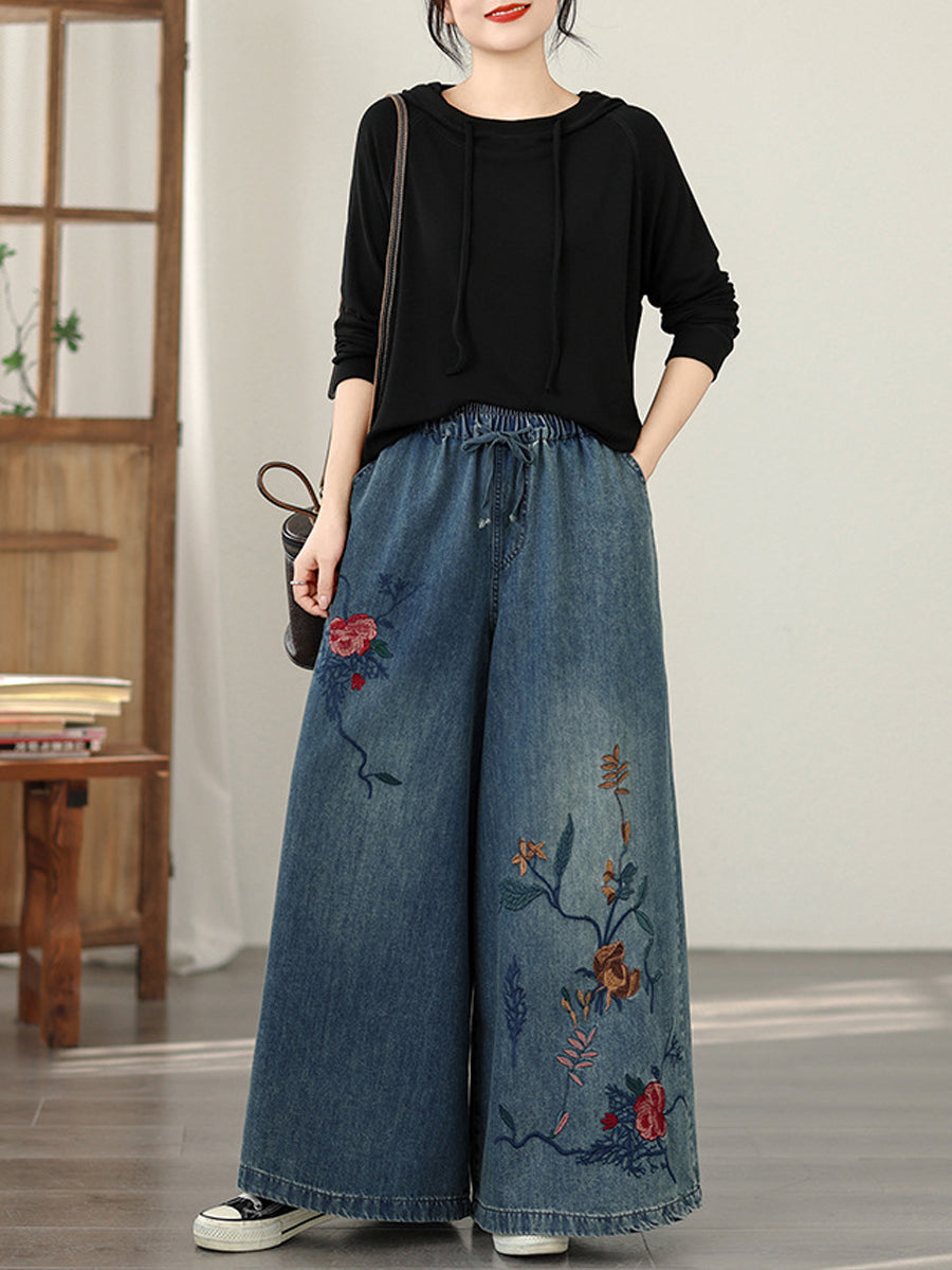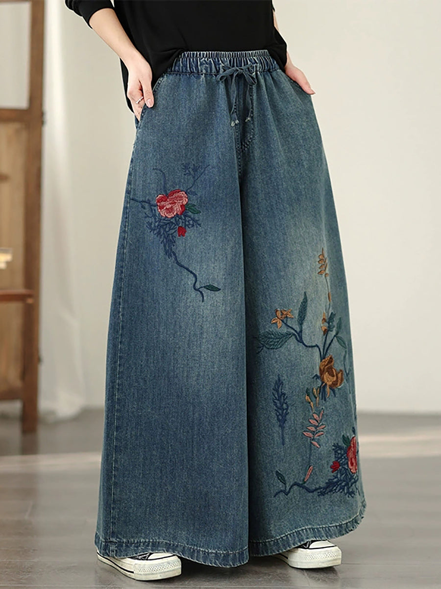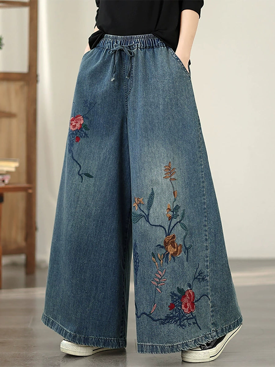 Kvinder Forår Vintage Denim Blomsterbroderi Vide Benbukser