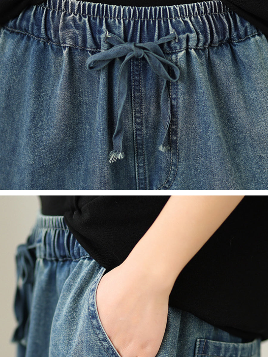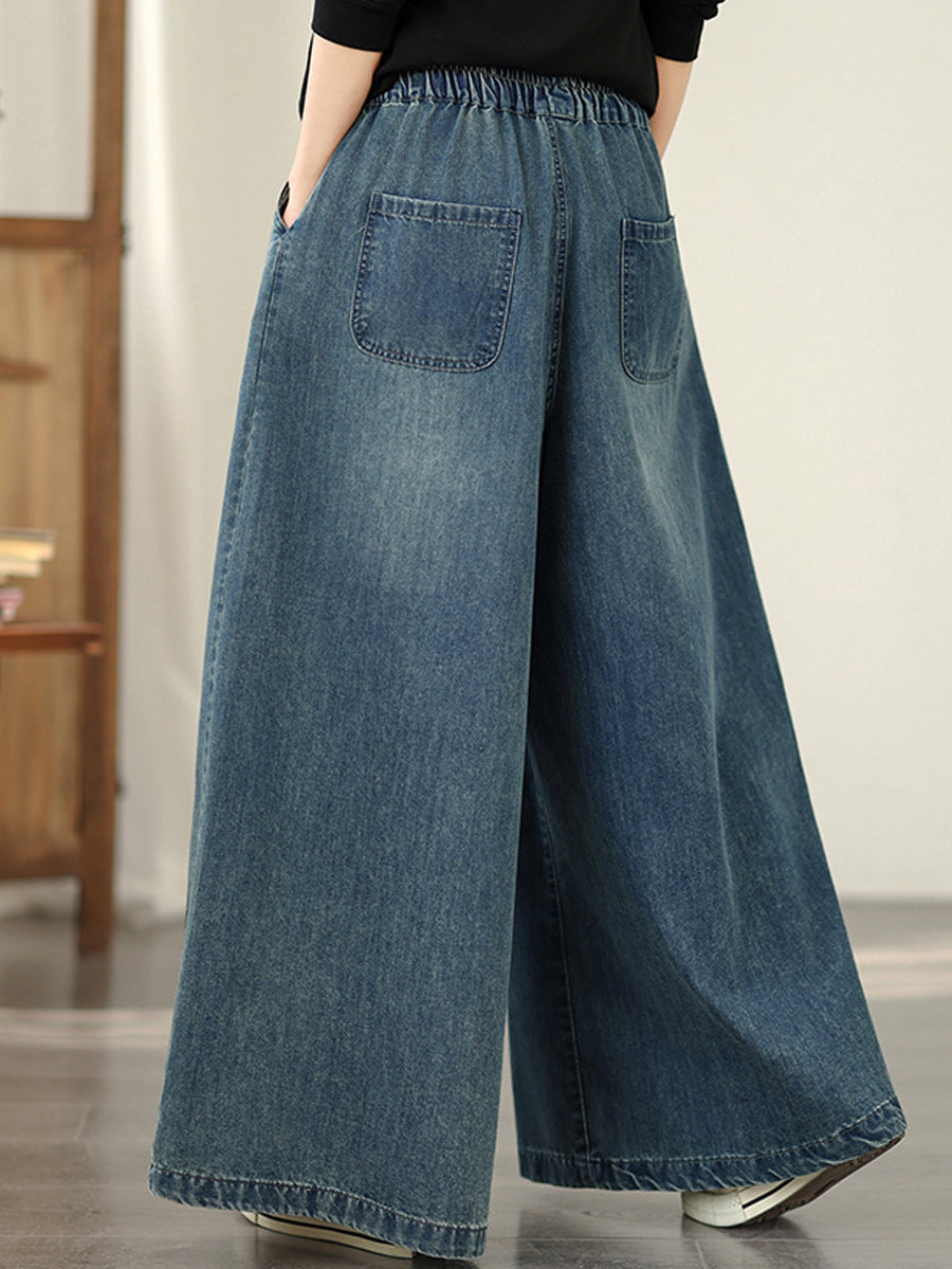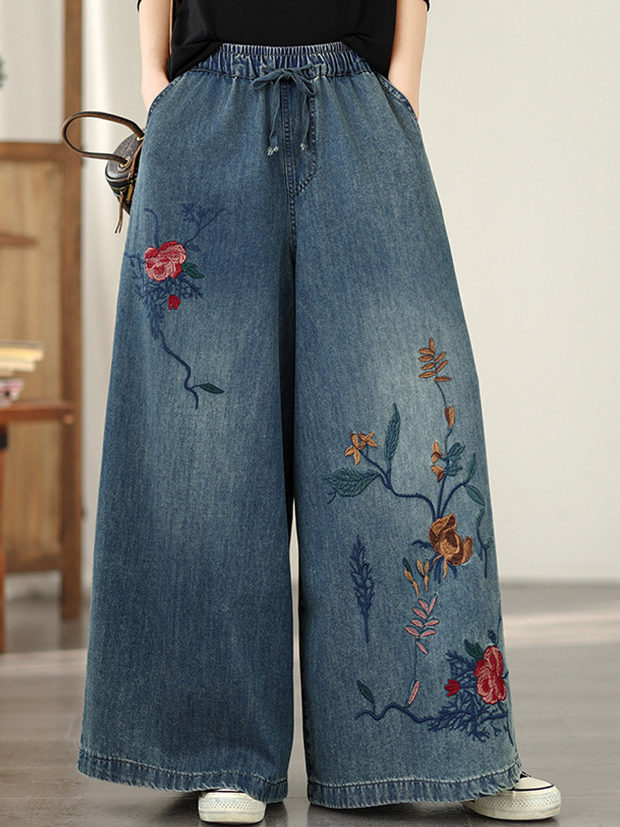 Kvinder Forår Vintage Denim Blomsterbroderi Vide Benbukser