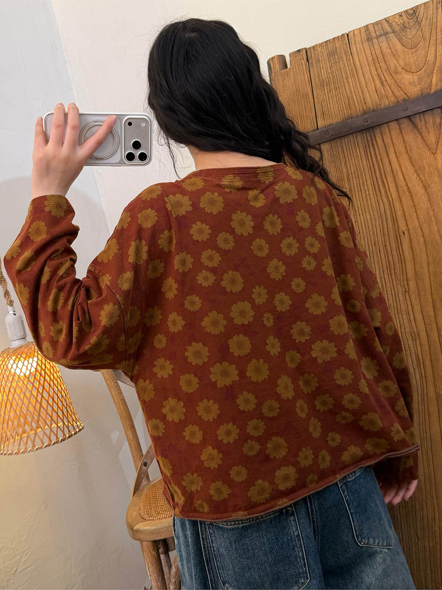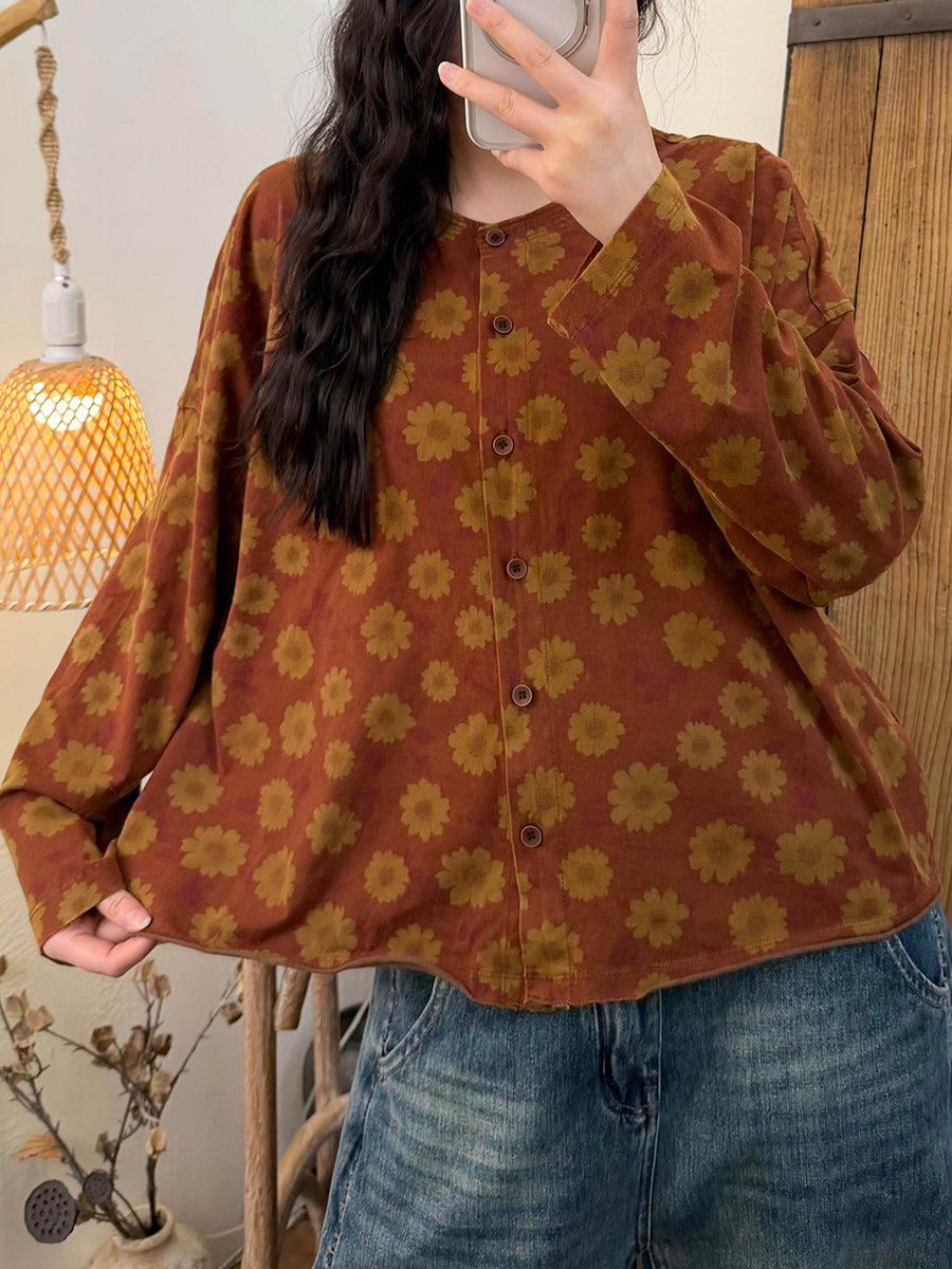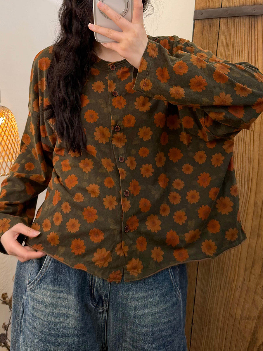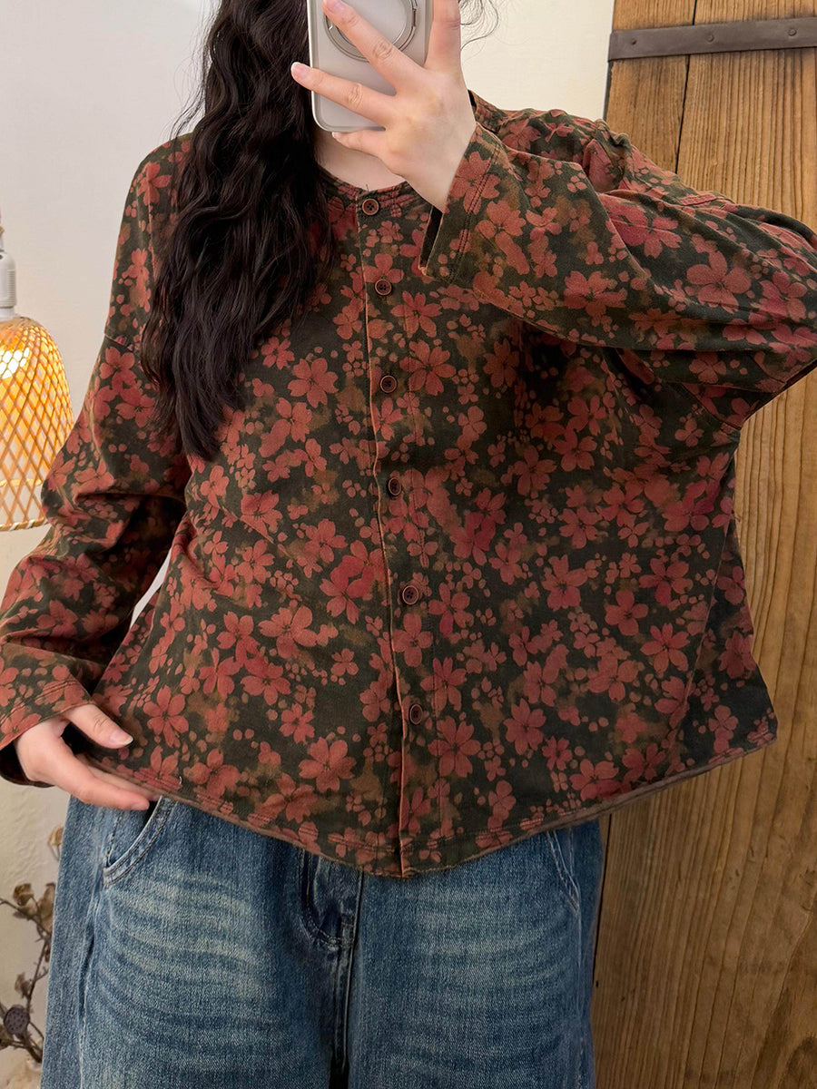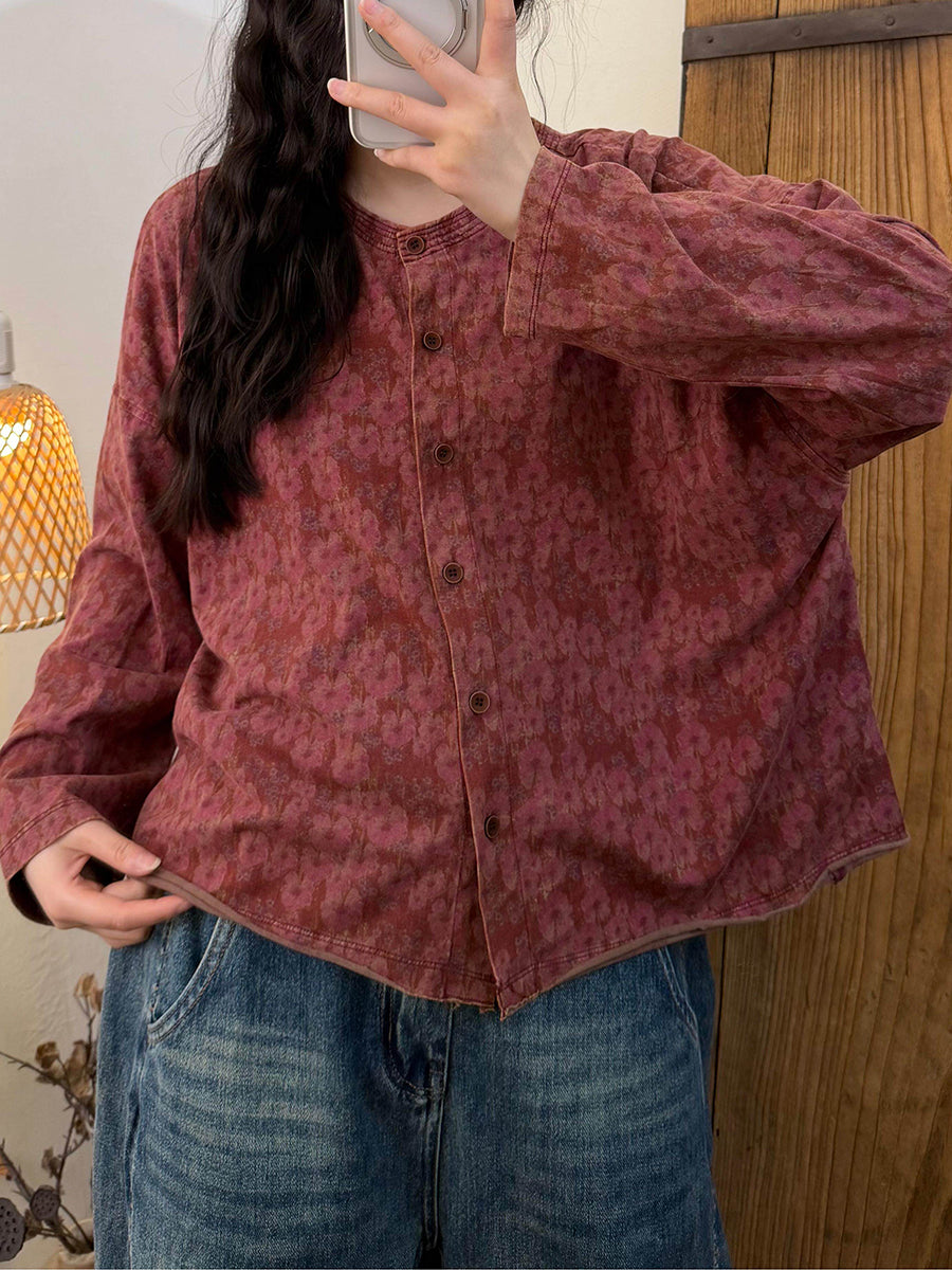 Dame forårsskjorte med vintage-blomster og O-hals