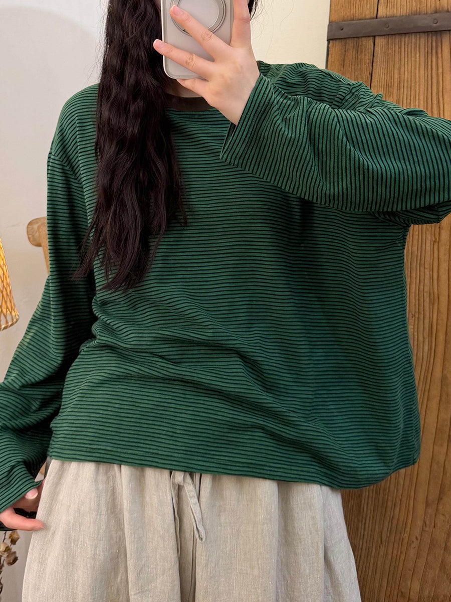 Kvinder Sommer Casual Stribet O-Hals Bomuldsbluse