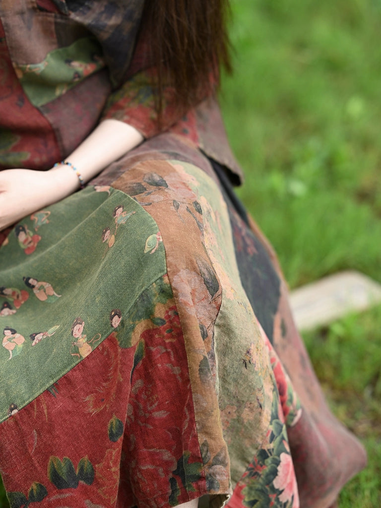 Denne sommerkjole til kvinder er fremstillet af en blanding af bomuld og hør og har en opretstående krave og et blomstermønster. Den har raglanærmer i fuld længde og går ned til læggen, hvilket gør den ideel til forårs- og sommerbrug.
