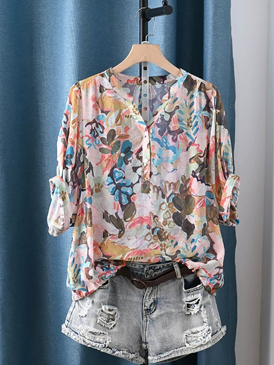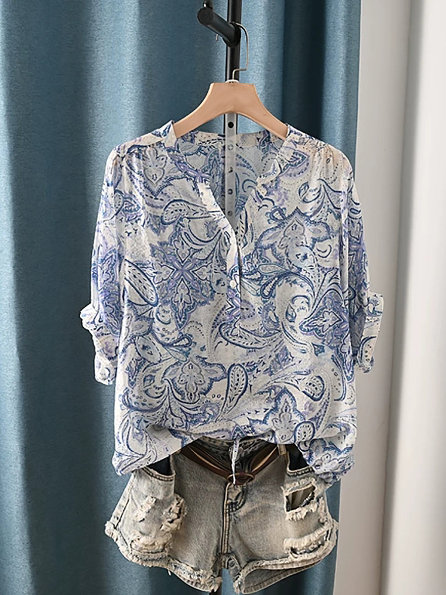 Kvinder Sommerbluse med etnisk blomst og V-hals