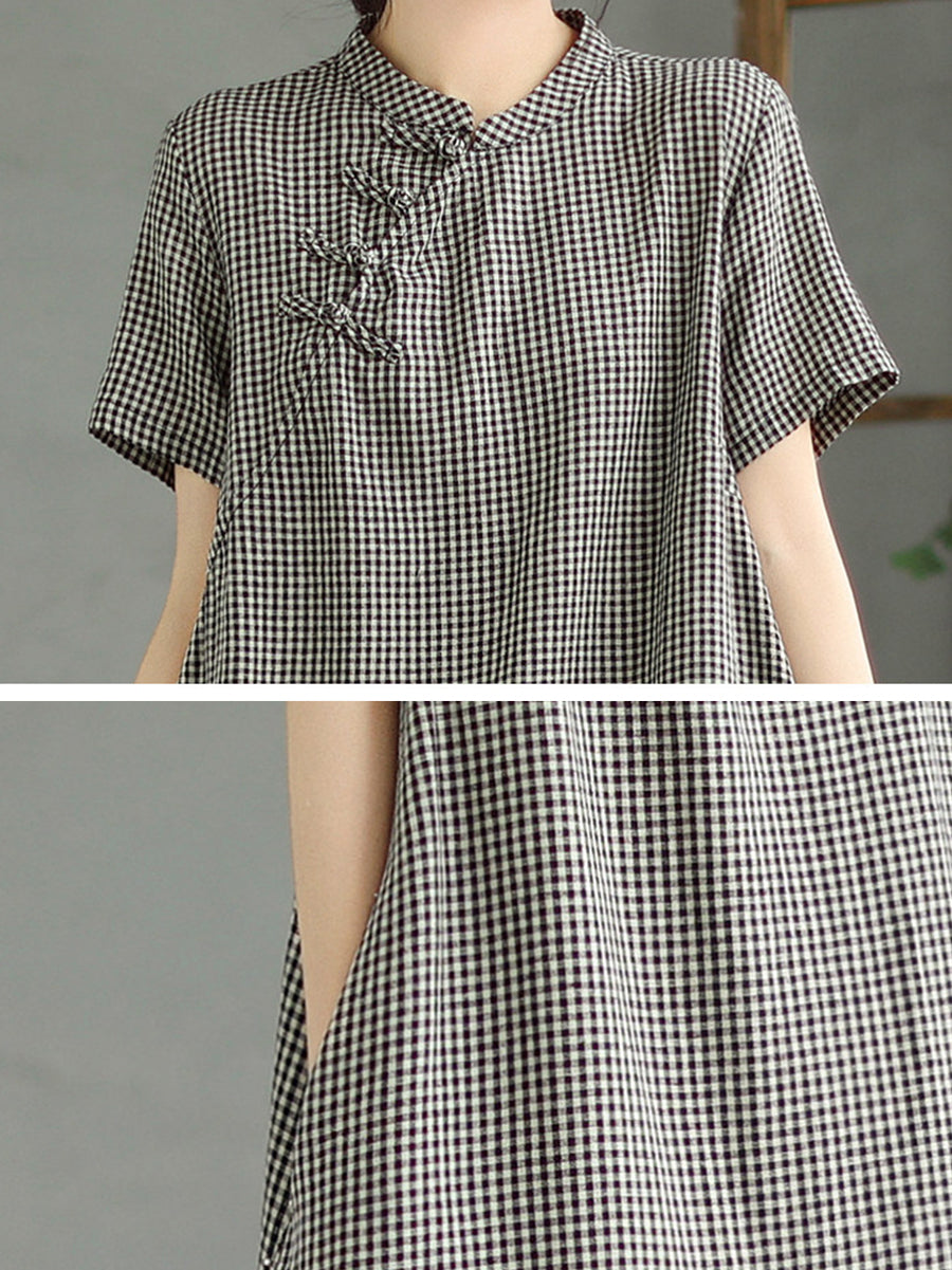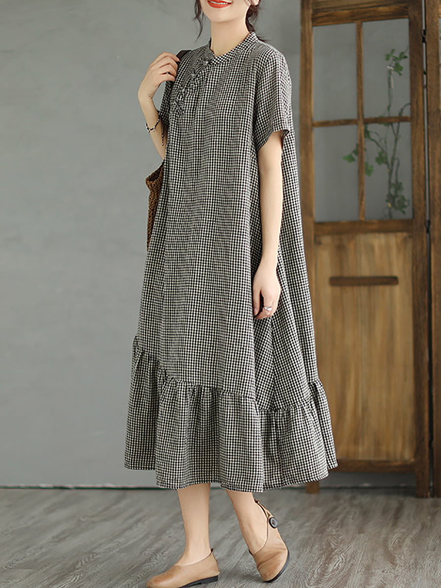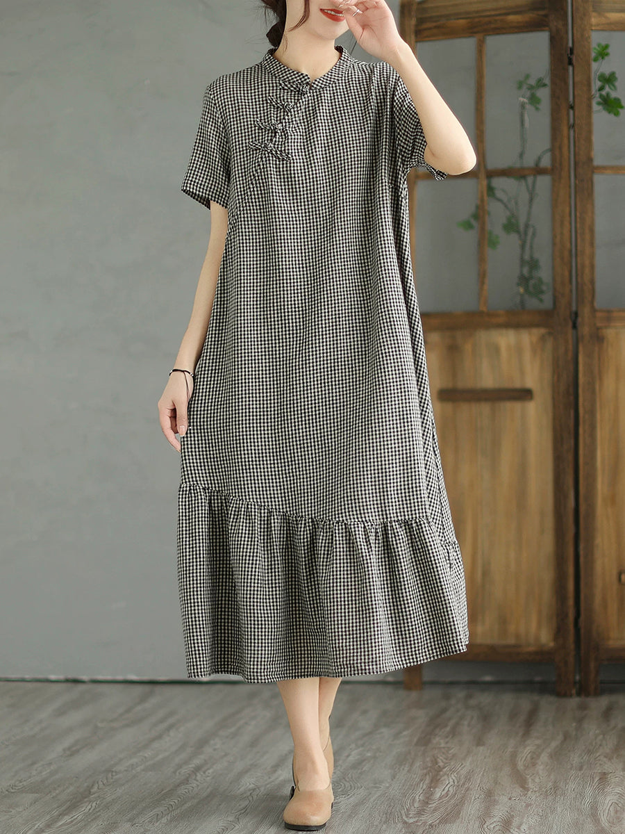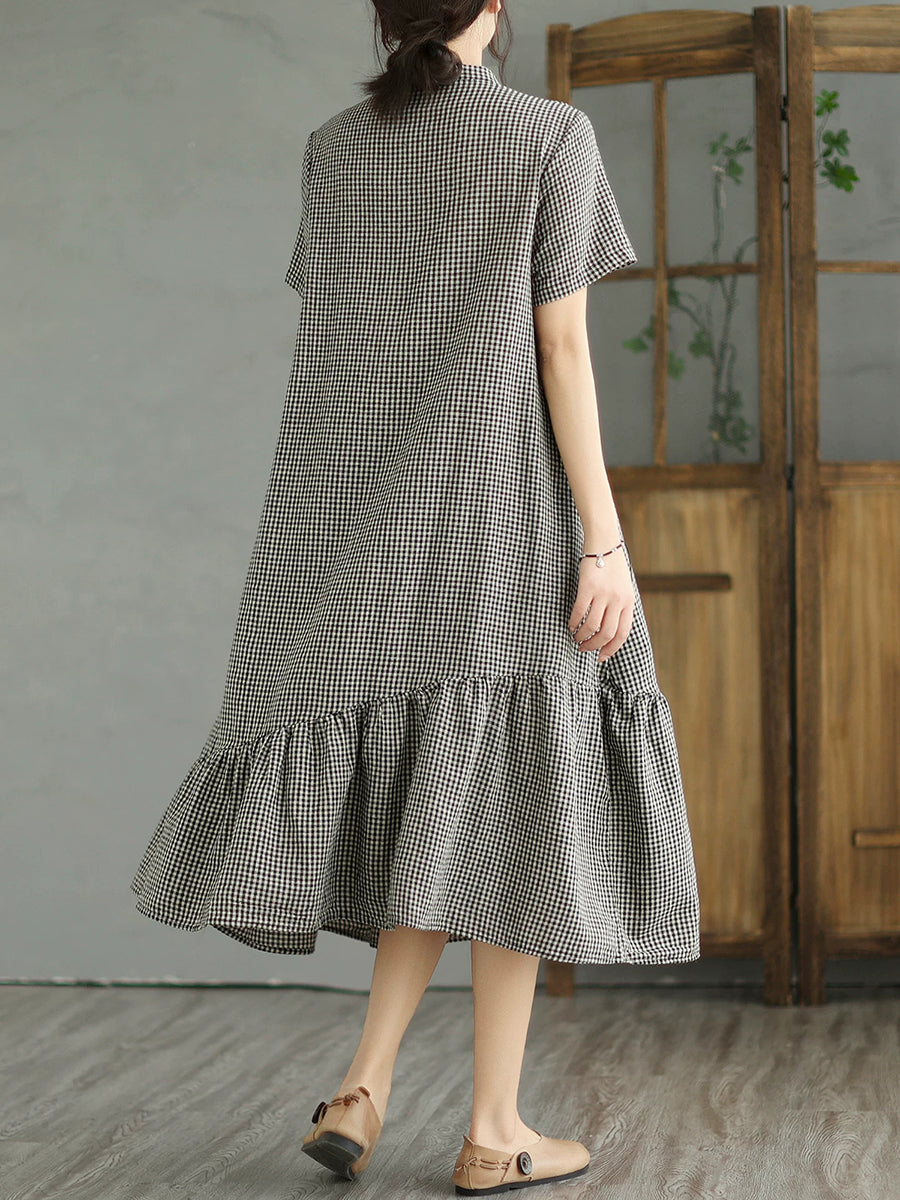 Kvinder Sommer Etnisk Plaid Stand Collar Kjole