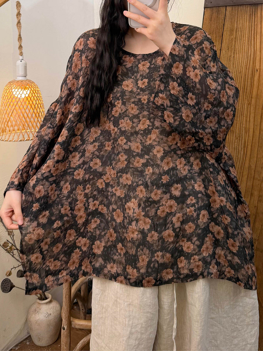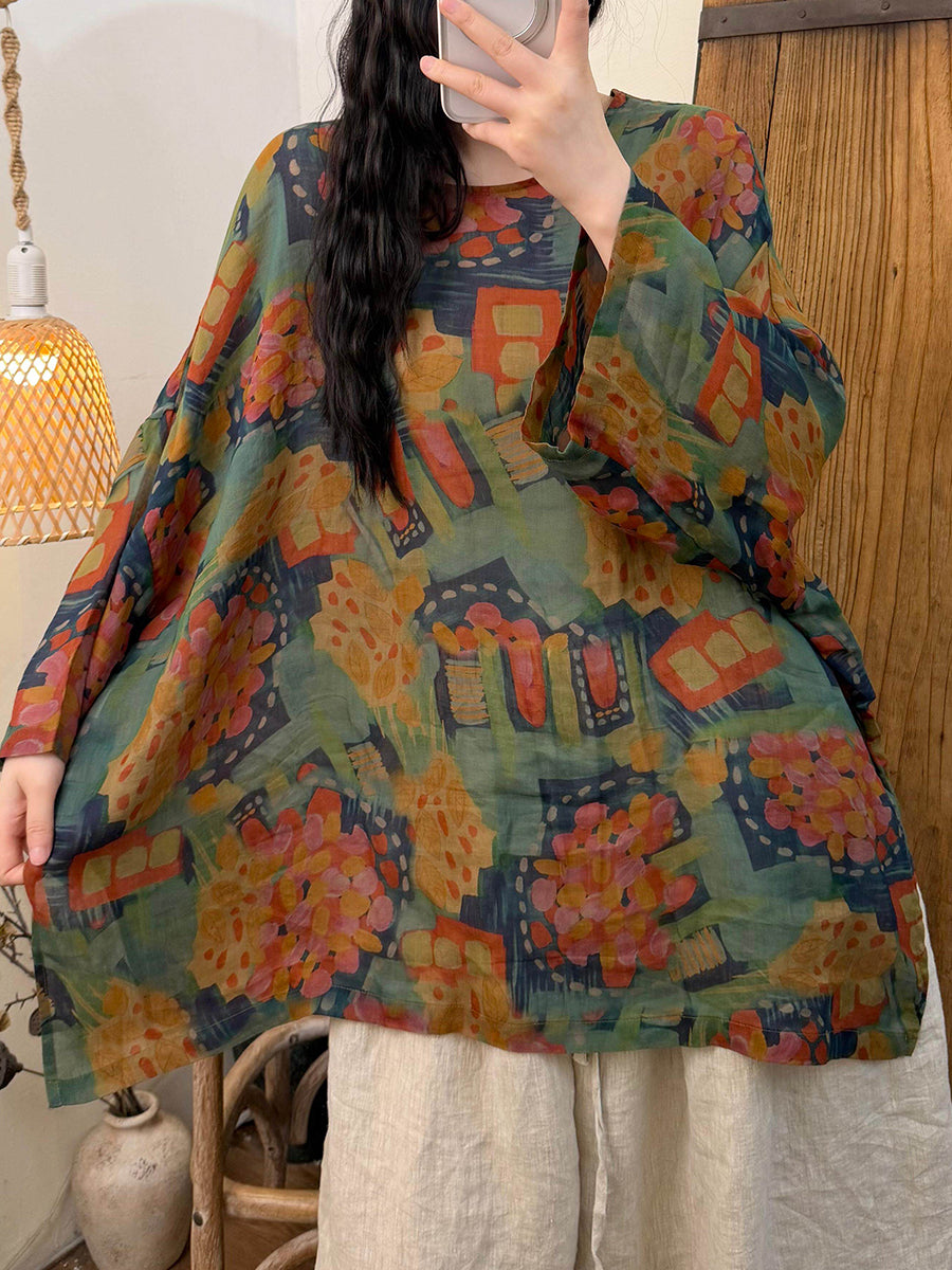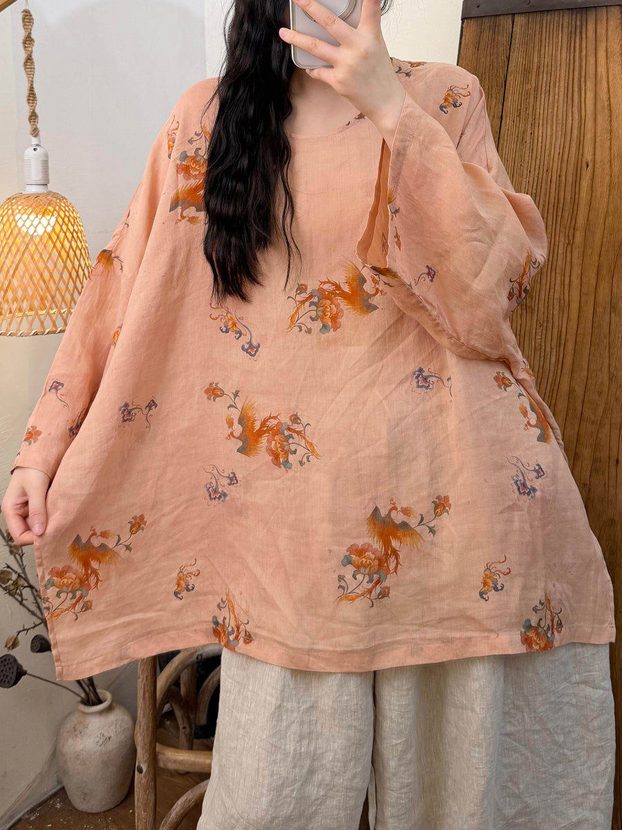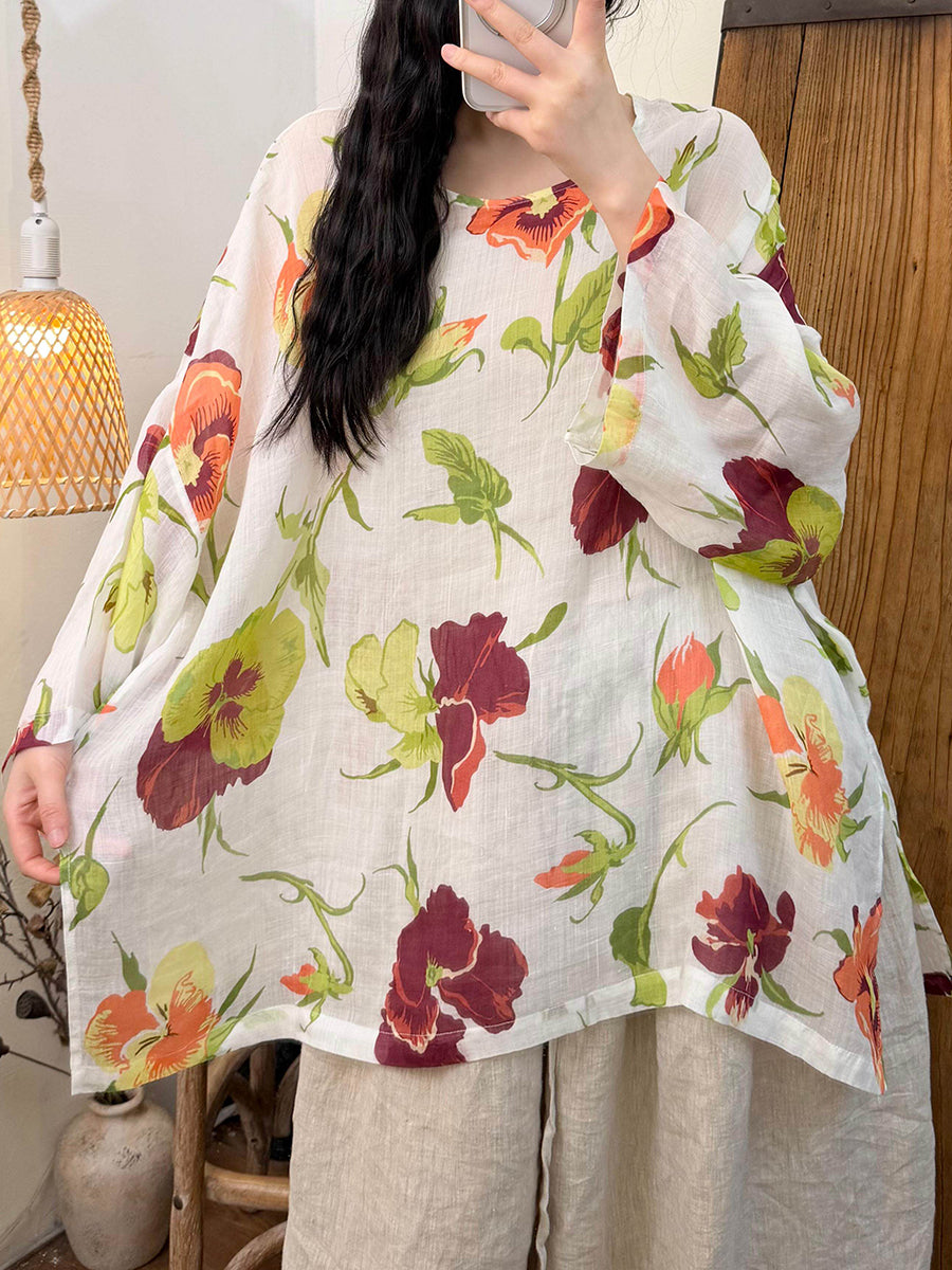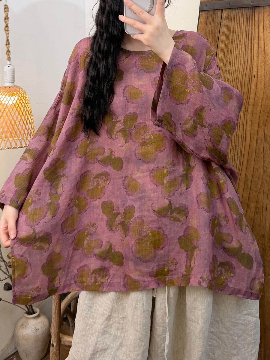 Kvinder Sommer Retro Blomster Ramie O-hals Bluse