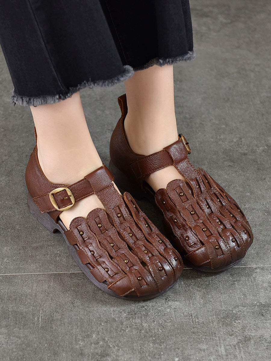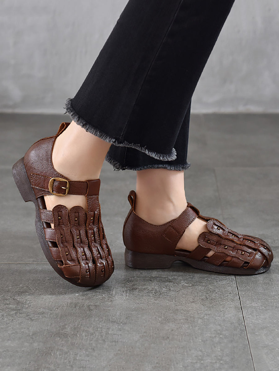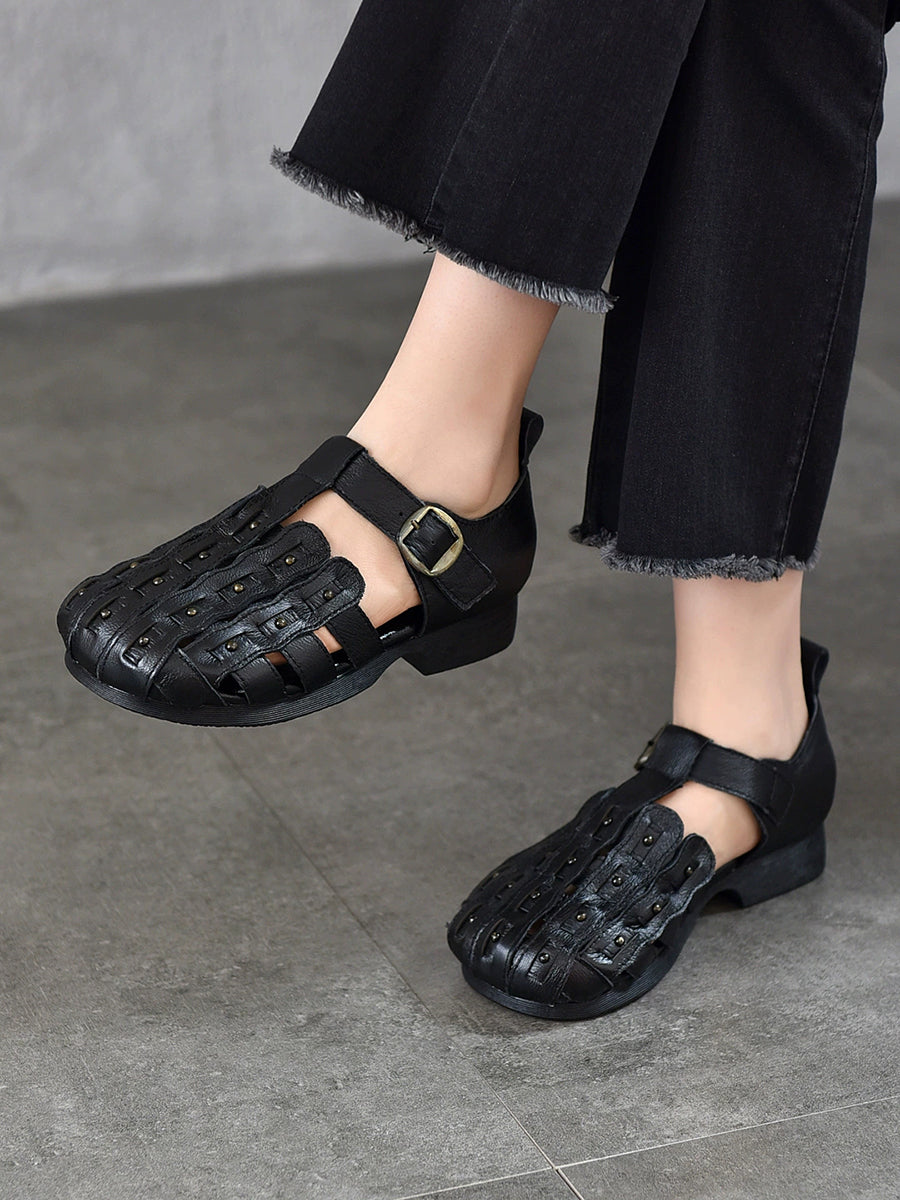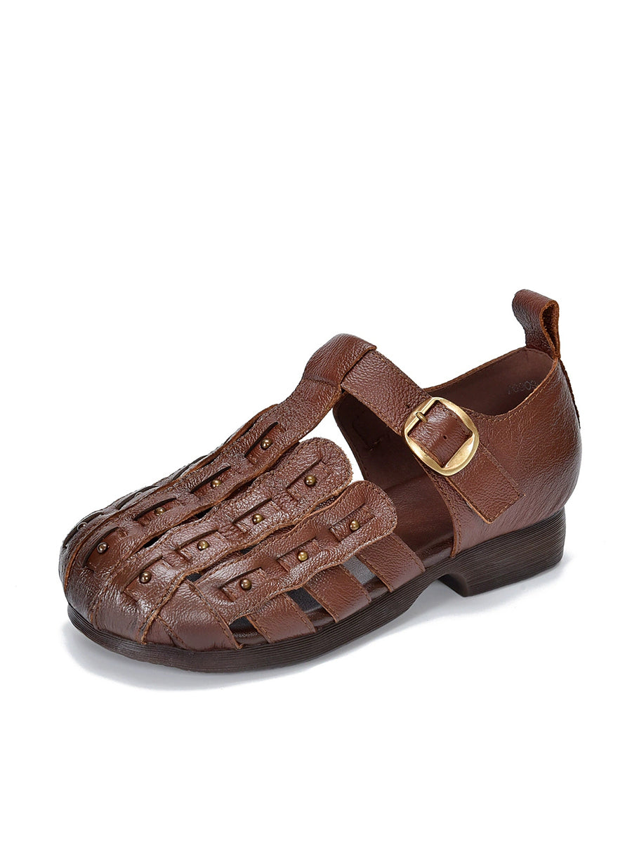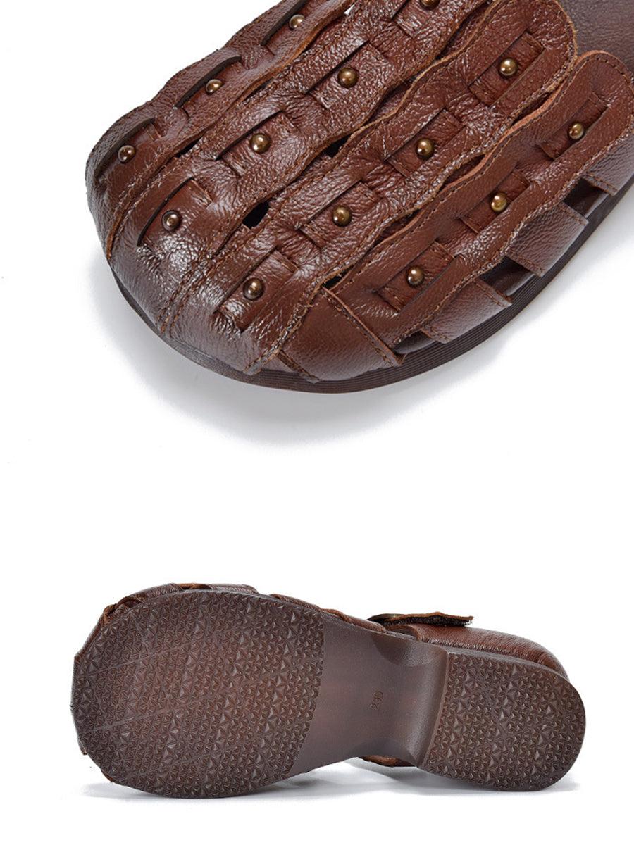 Kvinder Sommer Retro Ægte Læder Lav Hæl Sandaler