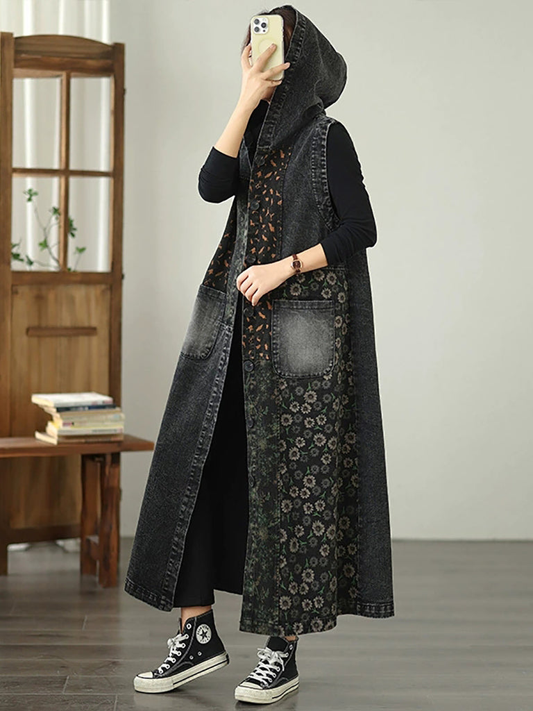 Kvinder Vintage Denim Blomster Spliced Hættetrøje Vest