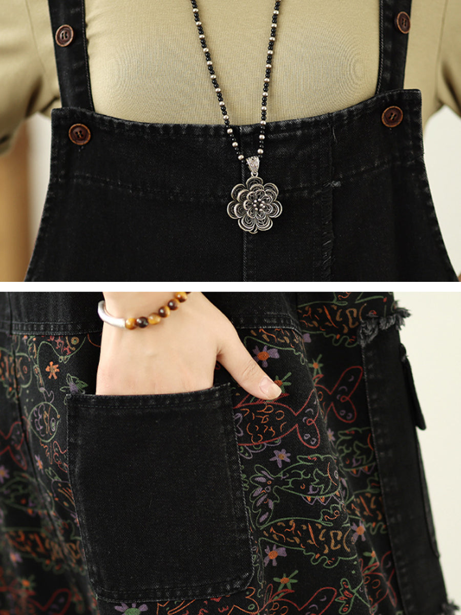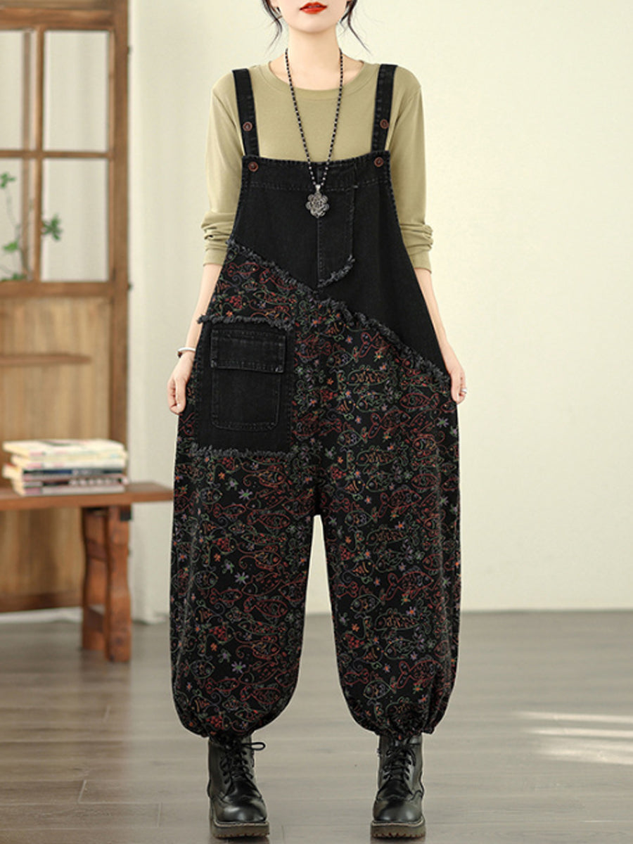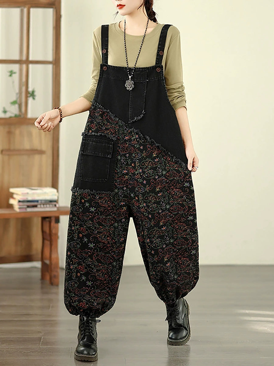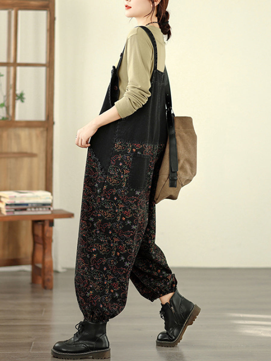 Kvinder Vintage Blomster Spliced Bomuld Løse Denim Jumpsuits