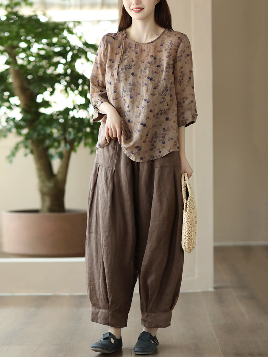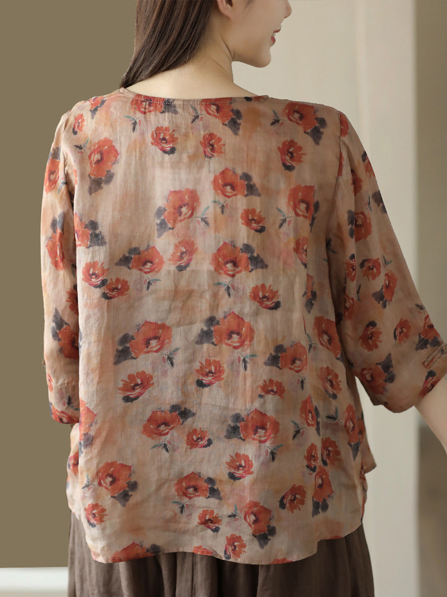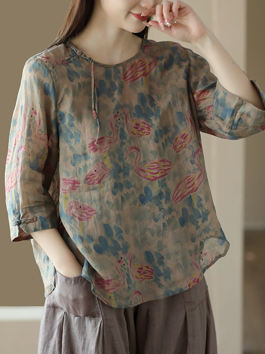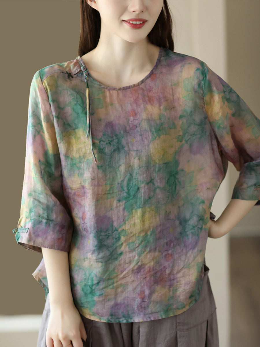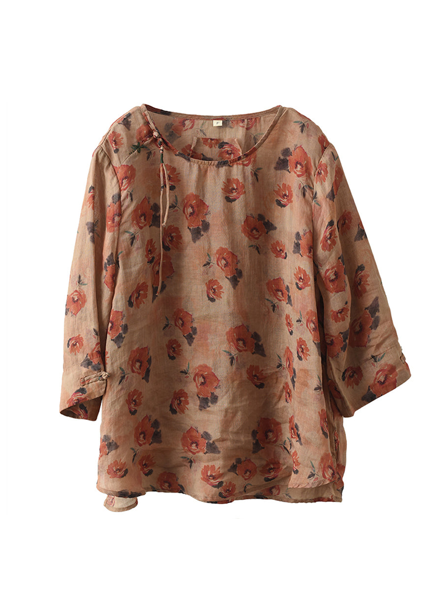 Kvinder Vintage Summer Floral Frog Pullover Linen Shirt