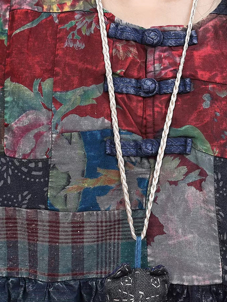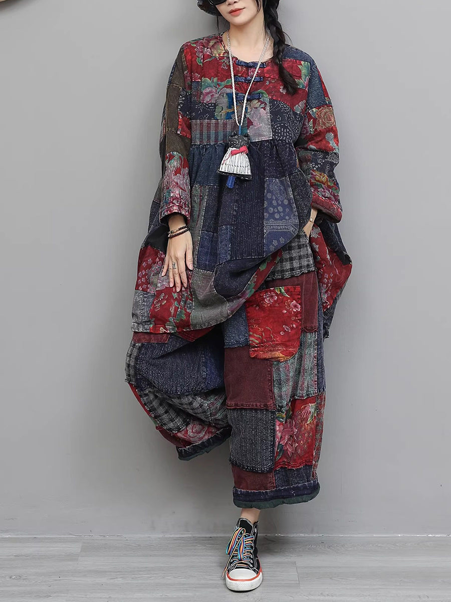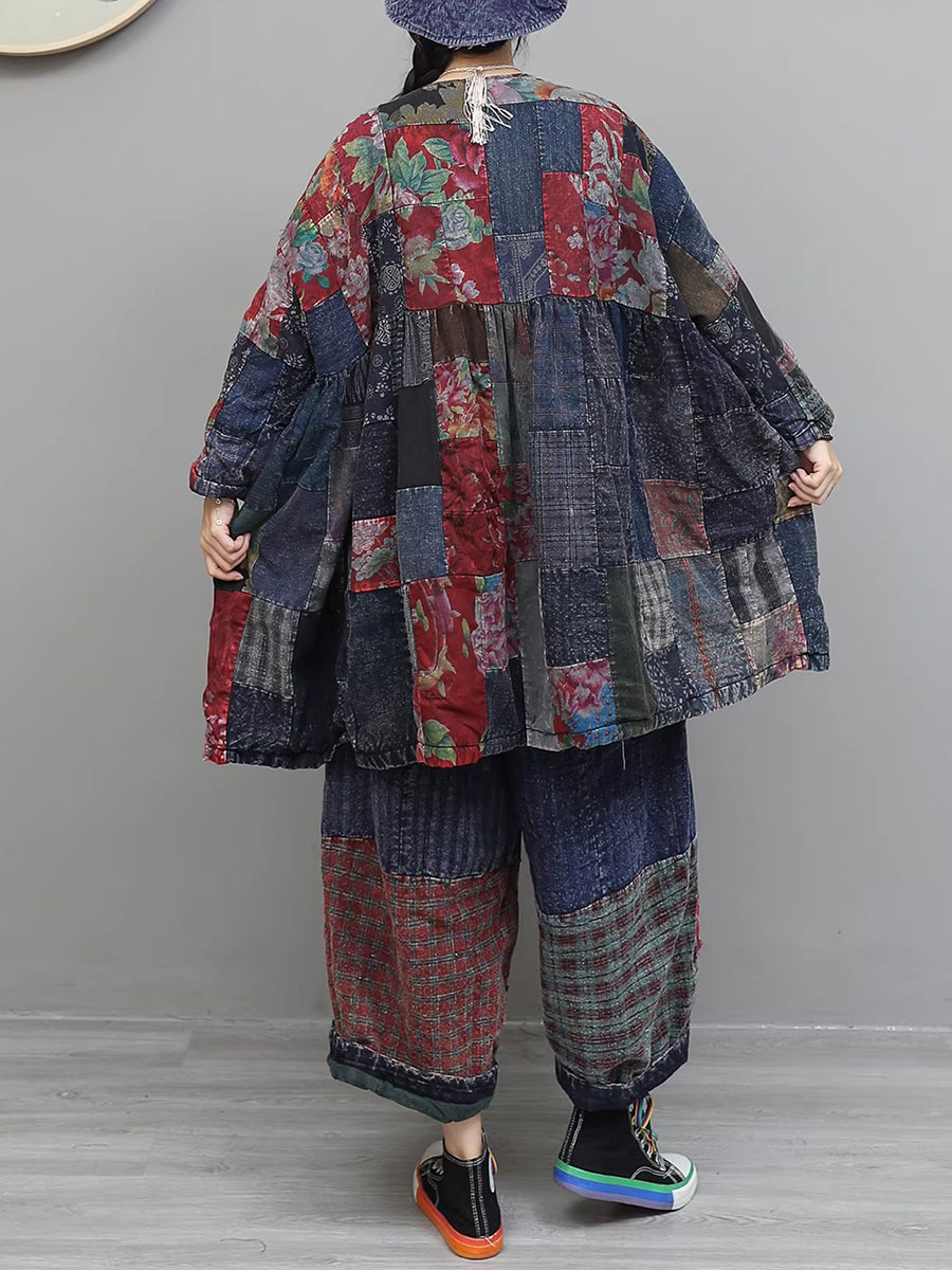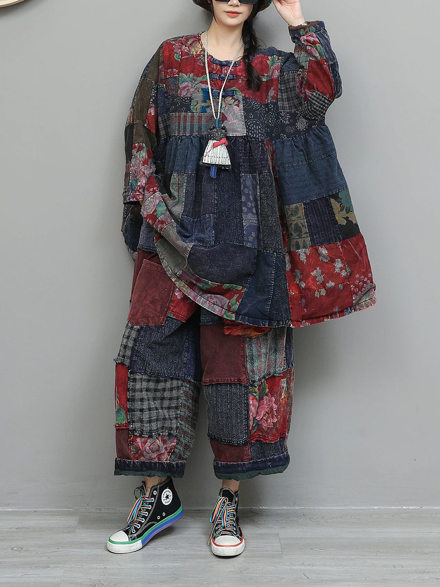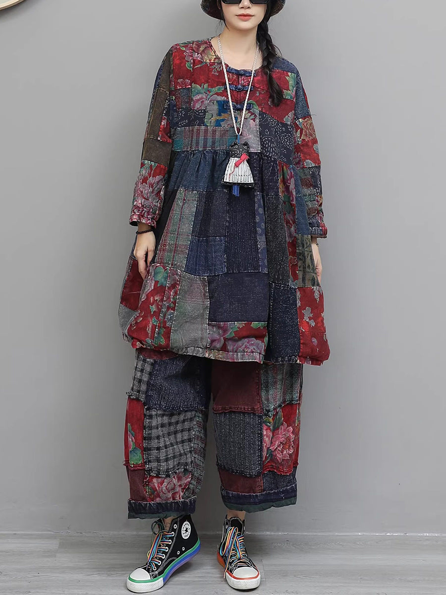 Kvinder Vinter Retro Patch Spliced O-Neck Polstrede Dragter