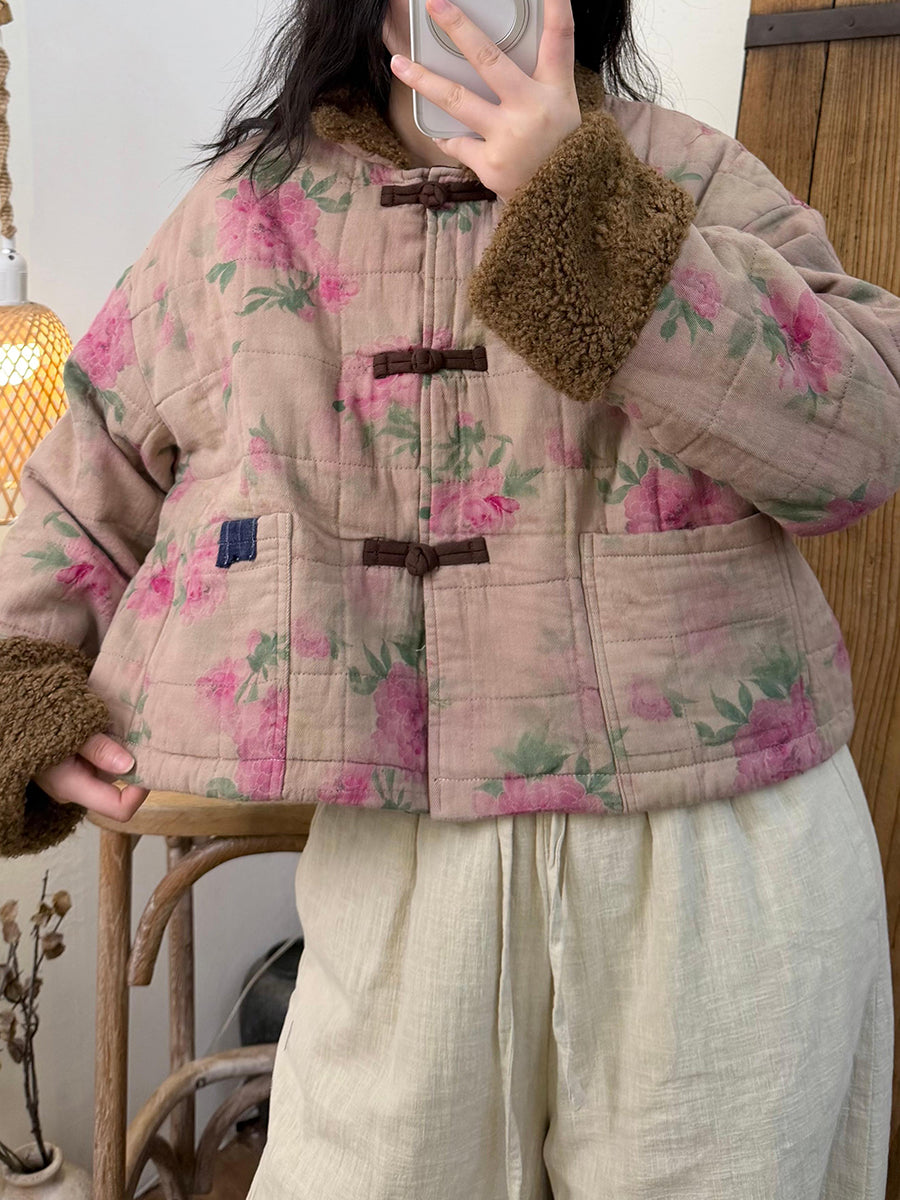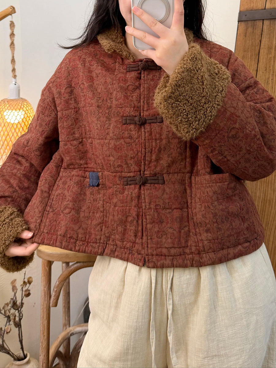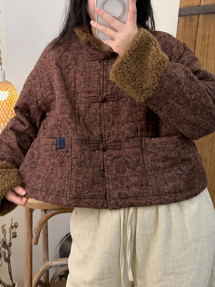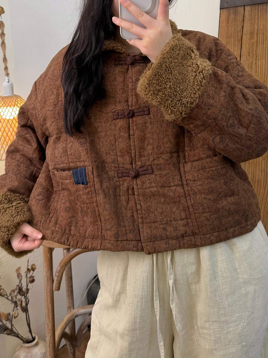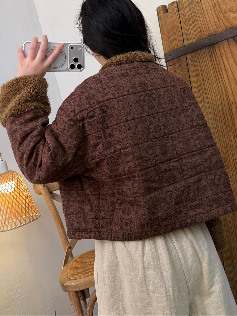 Kvinder Vinter Retro Print Fleece Spliced O-Neck Polstret Frakke